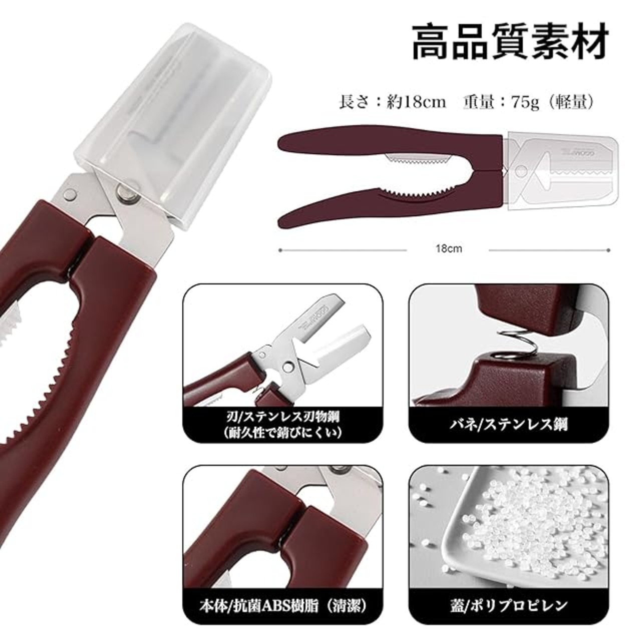 【高品質素材】材質:#刃/ステンレス刃物鋼(耐久性で錆びにくい) #バネ/ステンレス鋼 #本体/抗菌ABS樹脂(清潔) #蓋/ポリプロピレン #長さ:約18cm #重量:75g(軽量)
