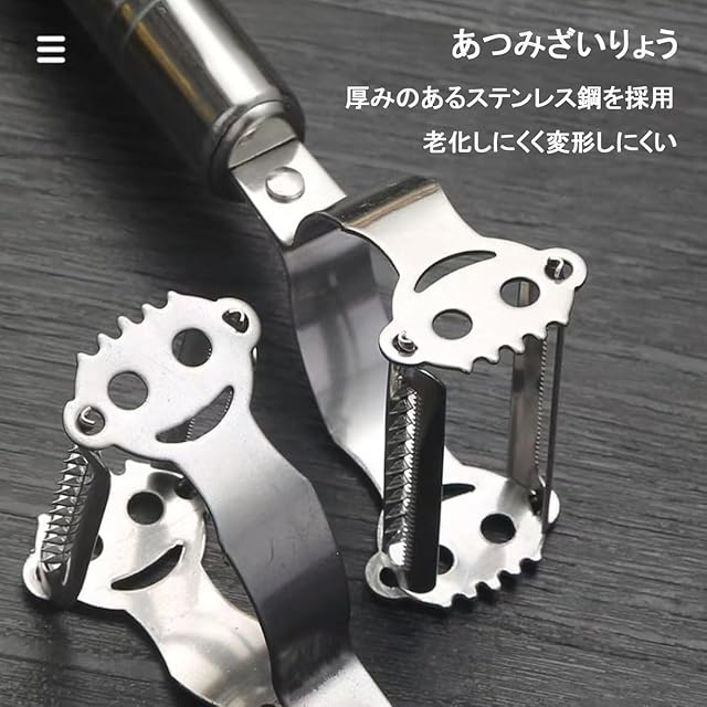 ステンレス製の多機能ピーラー。皮むきと千切りの両方ができる便利な設計で、軽量で使いやすく、食洗器対応でお手入れも簡単。キッチンの調理時間を短縮する実用的なキッチン用品です。