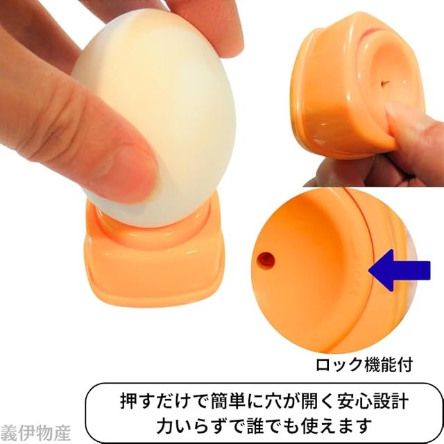 ゆでる前に小さな穴をあけるだけで、ゆで卵のカラがスルッときれいにむけます。 押すだけで簡単に穴が開く安心設計、力いらずで誰でも使えます。 コンパクトサイズで扱いやすく、ロック機能と付きで安心設計。