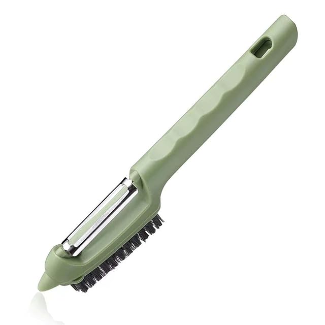 【キッチンマスタリー】:この多機能ピーラーは、ピーラーとクリーニングブラシを組み合わせて、あらゆる果物や野菜を簡単に処理できます。薄い果物や厚いジャガイモの皮を手早く剥くのに最適なピーラーで、キッチンの作業を効率化します。クリーニングブラシは、キッチンのシンク、コンロ、手の届きにくい隅を効果的に掃除します。