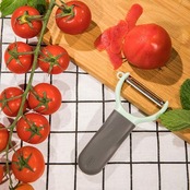 【ライフデザイン】切れ味の良い日本製のステンレス刃を採用して、食材に金属臭を移さずに、ギザギザの細かい刃はつるつるして滑りやすい果物や野菜に最適で、トマト・桃・プラム・キウイフルーツ・かぼちゃなど対応OK。ジャガイモの芽取りもできる。滑りにくく、やわらかいグリップ付き、シンプルで手になじみやすいデザインです。