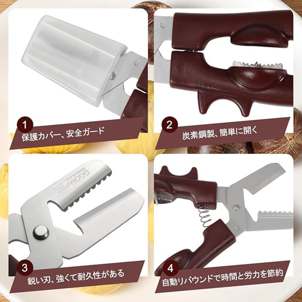■【栗むき器】十字カットで簡単に切れ込み、皮むき便利。<br><br> ■【鋭い切れ味】直刃+ギザ刃で鬼皮・渋皮をしっかり除去。<br><br> ■【高品質素材】高炭素鋼刃・クロム鋼本体・抗菌ABSハンドル。<br><br> ■【握りやすい】滑りにくいソフトグリップ、誰でも簡単に使用。<br><br> ■【お手入れ簡単】布やスポンジで洗浄、食洗機不可。<br>