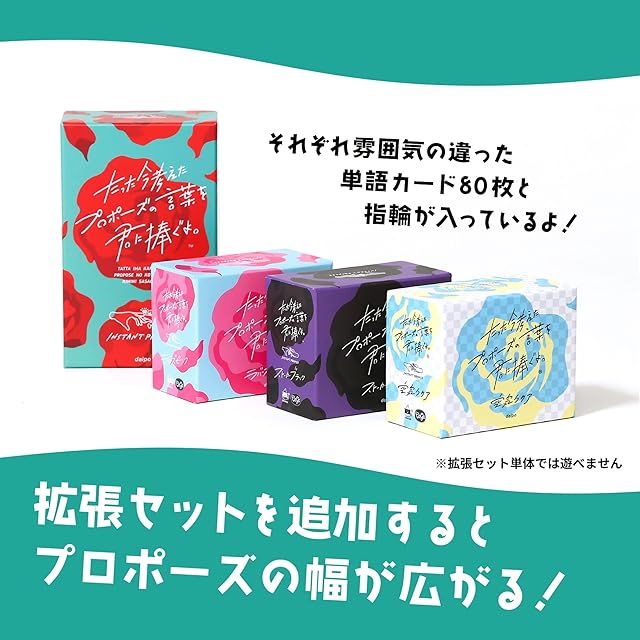 シリーズ累計25万部突破!!<br> <br> 【 ゲームマーケット大賞2018優秀作品賞受賞】<br> 【2018-2019 ボードゲームカフェ大賞受賞】<br> <br> 人生で最も幸せな瞬間!それはプロポーズの時!<br> このゲームはそんな最高の瞬間を何度も繰り返し体験することができるゲームです。<br> 配られたカードを自由に組み合わせて最高のプロポーズの言葉を作りましょう!<br> <br> 【ゲームの流れ】<br> 1 各プレイヤーは指輪カウンターを3コ、初期カード(繰り返し使うカード)6枚を持ってスタート。<br> 2 ジャンケンで【親】を決め、他のプレイヤーは山札から単語カードを6枚ずつ引いて伏せておく。<br> 3 【親】が顔を伏せ、ゆっくり10数え始めたら他のプレイヤーは伏せられたカードをオープンし、自由に組み合わせて素敵なプロポーズの言葉を作る。<br> 4 【親】が10数え終わったら、【親】の左隣りのプレイヤーから順番にプロポーズの言葉を読み上げ、最後に「結婚しよう!」と言いながら自分の指輪を【親】に差し出す。<br> 5 【親】は、最もグッときたプロポーズの言葉を捧げたプレイヤーの指輪を受け取る。<br> 6 【親】の左隣りのプレイヤーが次の【親】になり、2〜5を繰り返し3コの指輪が最初になくなったプレイヤーの勝利。<br> <br> 『たった今考えたプロポーズの言葉を君に捧ぐよ。』の遊び方動画<br> https://www.clagla.jp/view/item/000000000001<br> <br> 【内容物】<br> 遊び方説明書:1部<br> 指輪カウンター:18コ<br> 初期カード:36枚<br> 単語カード:164枚<br>