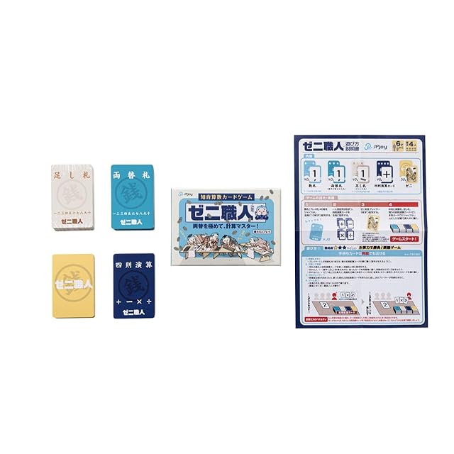 「ゼニ職人」は、算数の基礎となる四則演算(たし算・ひき算・かけ算・わり算)を楽しく学べる対戦型カードゲームです。2〜4人で遊べるため、家族や友達との交流を深めながら学習できます。プレイヤーは両替屋となり、数字カードと計算記号カードを組み合わせて目標の数値を作り出すことに挑戦します。正解すれば「ゼニ」を獲得でき、間違えると失うというスリリングな展開で、子どもたちの興味を引きつけます。ゲーム内通貨「ゼニ」を使った駆け引きを通じて、計算力だけでなく、金銭感覚や判断力も自然と身につきます。幼稚園高学年から小学生まで幅広い年齢層で楽しめ、算数が苦手な子どもでも継続的に取り組める工夫が施されています。遊びながら学べる画期的な教育ツールとして、お子様の算数学習をサポートします。