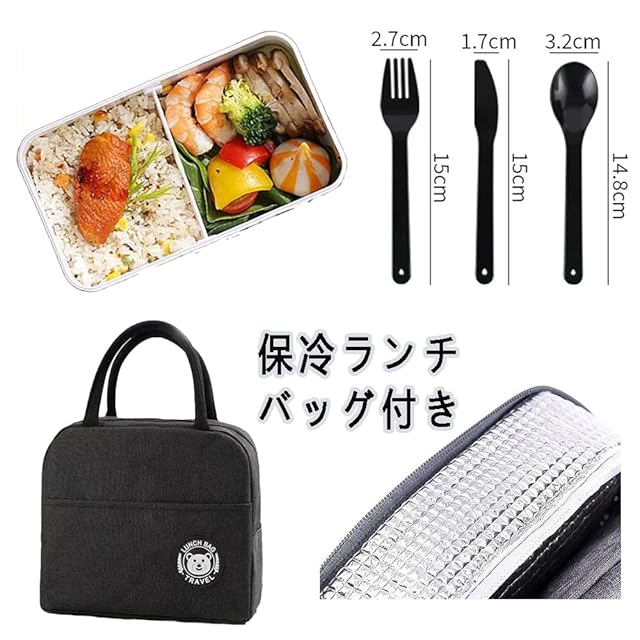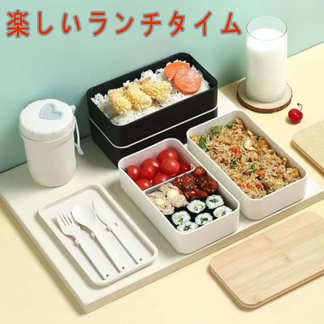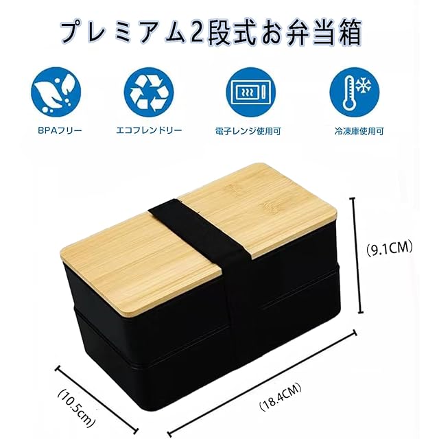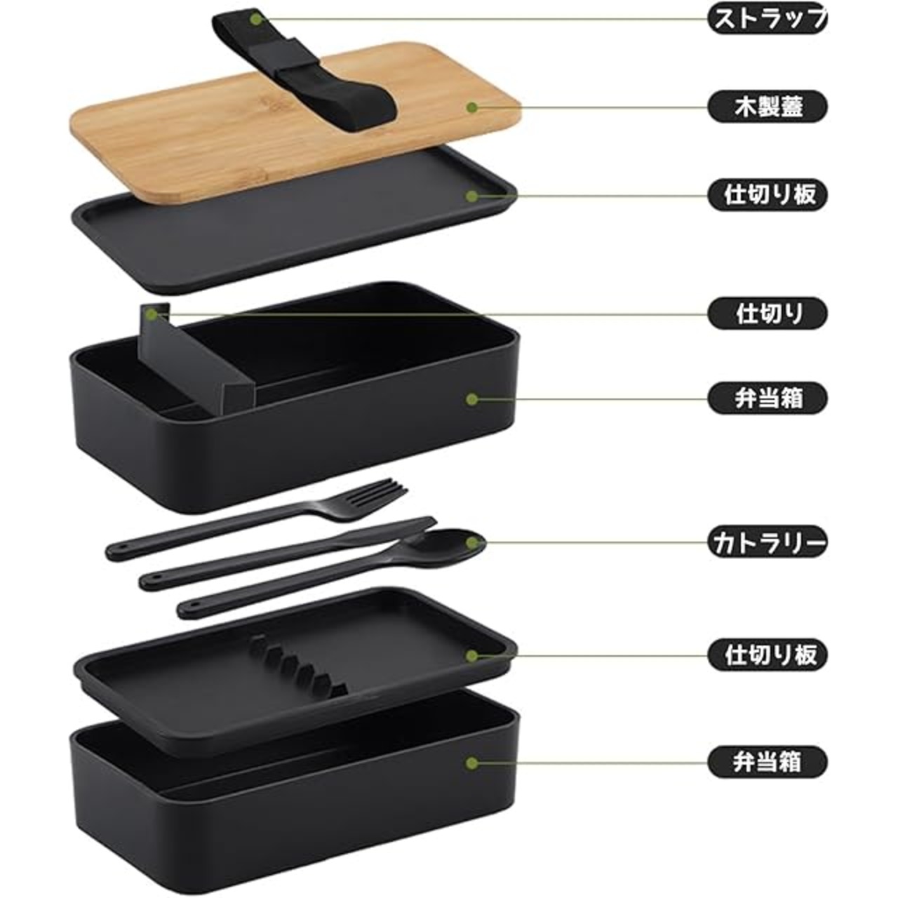 商品名:プレミアムお弁当箱 2段 ランチボックス 大容量 カトラリー付き ストラップ付き 密閉性 漏れ防止 仕切付き 運動会 ピクニック 通学 通勤 保存容器 電子レンジ対応 食洗器対応 男女兼用 洗い簡単 おしゃれ (黒セット)
