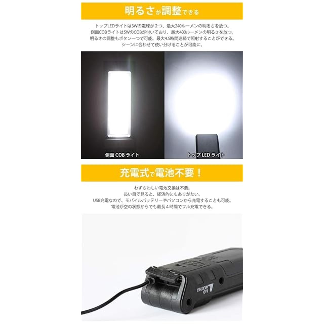 アウトドアブランドのラドウェザーから、<br>マルチに使えるLEDライトが誕生した。<br><br>乾電池が不要の充電式なので、繰り返し使えて経済的。<br>更にスマートフォンへの充電も可能。<br>停電時や野外など、電源が確保できない時には安心の機能だ。<br>充電残量も一目でわかるので、使用中に突然充電が無くなる心配は無い。<br><br>■作業灯にも懐中電灯にもなる2way点灯<br><br>懐中電灯の様に遠くまでスポットで照らせるトップLEDライトと<br>作業灯やデスクライトの様に周囲全体を広く照らす側面COBライトの<br>2種類の点灯を切り替えることができる。<br>状況にあわせて使い分ければ、これ1つで様々なシーンに対応。<br><br>■COBによる面発光でワイドな 照射<br><br>側面ライトはCOB高輝度ライト採用。<br>COB(チップオンボード)とはLEDの光を1つにまとめることで、<br>均一なひとつの面で発光し、光のバラつきやムラのない白色光を実現した発光方式。<br>LED特有のつぶつぶ感を抑え、高反射、高放熱、低劣化が特徴です。<br><br>■明るさが調整できる<br><br>トップLEDライトは3Wの電球が2つ、最大240ルーメンの明るさを放つ。<br>側面COBライトは5WのCOBが付いており、最大400ルーメンの明るさを放つ。<br>明るさの調整もボタン一つで可能。最大4.5時間連続で照射することができる。<br>シーンに合わせて使い分けることが可能に。<br><br>■充電式で電池不要!<br><br>わずらわしい電池交換は不要。<br>長い目で見ると、経済的にもありがたい。<br>USB充電なので、パソコンから充電することも可能。<br>電池が空の状態からでも最長4時間でフル充電できる。<br><br>■充電残量がひと目でわかる<br><br>「充電を忘れた」などのトラブルを防ぐことができるように、<br>電池残量表示が付き、背面の緑色のライトが、充電残量を5段階で表示するので、<br>充電残量が一目でわかります。<br><br>■スマホ充電可能<br>スマートフォンなどの機器に充電が出来ます。<br>(スマートフォンのフル充電1回分 ※機種による)<br>停電などの緊急時、キャンプや釣りなど電源を確保できないアウトドアで<br>はとても役に立ちます。<br>対応機器へは付属のケーブルで充電可能です。<br>※生産時期によって端子が異なります。お選びいただけません。<br>(Micro USB または USB Type-C)<br><br>■全方向を照らすことができるマルチアングル<br><br>ヘッド部分が270度可動するので、<br>照らしたい方向を無駄なく的確に照らす事ができます。<br>可動箇所が2か所あるので、細かい微調整をすることができストレスがありません。<br>使わない時は折りたたんでコンパクトに持ち運べます。<br><br>■強力磁石で色々な場所に固定できる<br><br>本体底部分は強力なマグネットになっているので、<br>金属製の棚や車のボンネット、プレハブ倉庫の壁や天井など<br>様々な場所に貼り付けることが可能。<br>作業中にライトを持つことなく、両手が使えるので便利です。<br><br>■フック付き<br><br>本体底部分にフックが付いているので、吊り下げることが可能。<br>部屋やテントで室内灯としても使ったり、<br>デスクライトにして読書することが可能。