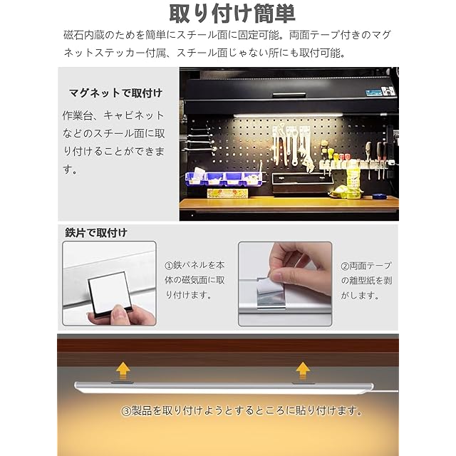 導光板を使う場合、光は明るく、均一で、柔らかく、目に優しいです。 導光板を使わない場合、光の分布が均一ではなく、明るさにムラができ、目の疲れを引き起こしやすくなります。 面発光で、ワイドな35mmの発光面は従来のバーライトよりも輝度が50%以上向上し、側面発光デザインと内蔵導光板により、均一でやさしい光を発し、目に優しく、学習や仕事の際の完璧な照明ライトです。 微調整に適した中間スイッチで、色温度と輝度を簡単に調整できます。 1.鉄パネルを本体の磁気面に取り付けます。 2.両面テープの離型紙を剥がします。 3.製品を取り付けようとするところに貼り付けます。
