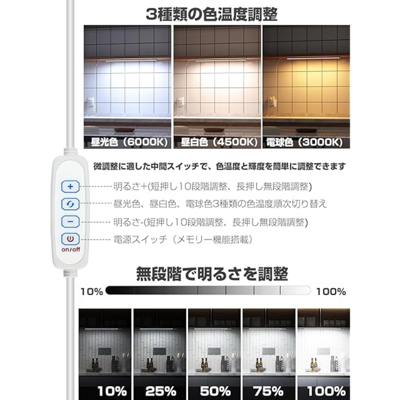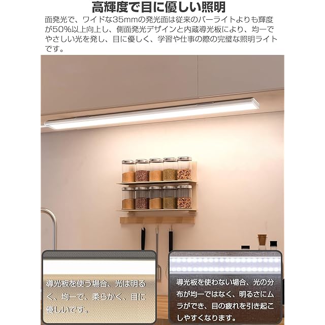 商品名:Baisico LEDバーライト キッチンライト 蛍光灯 USB給電 35mmワイド発光面 新型 超高輝度 1200LM 12W 消費電力 0.9cm 超薄型 昼光色/昼白色/電球色 3段階色調整、無段階輝度調整可能 側面照射型 側面発光デザイン 均一で柔らかな光 目に優しい マグネット内蔵 強力両面テープ付き鉄パネル内蔵 (40cm)