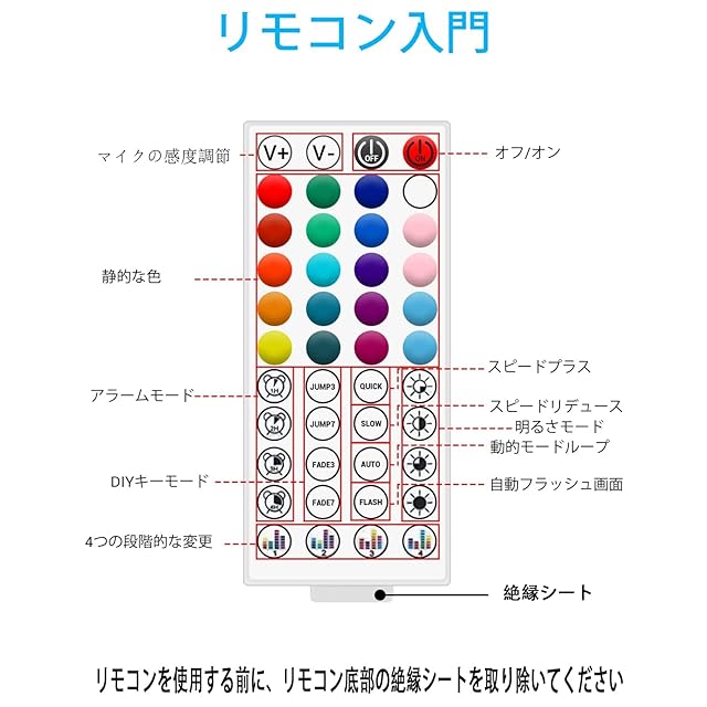 【音声同期・タイマー機能】 音楽とマイク機能があり、音楽や声のリズムに合わせてテープライトのR/G/B光が変化、様々な光を演出し、夢のような視覚空間を作り出します。