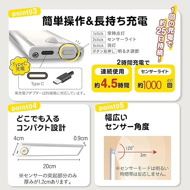 ✅【手軽さと持続力を兼ね備えた設計】ヨルテラスのセンサーライトは、USB Type Cによる充電が可能です。これは多くのデバイスで採用されている汎用的な充電規格であり、特別な充電器を必要とせず、既存の充電器やパソコンのUSBポートから簡単に充電することができます。また、1回のフル充電で約4~5時間の連続使用が可能で、センサーライトモードでは約20日間の使用が可能です。これにより、頻繁な充電の手間を省き、あなたの生活をスムーズにサポートします。さらに、操作は1つのボタンだけで可能なため、誰でも簡単に使うことができます。ヨルテラスは、手軽さと持続力を兼ね備え、あなたの生活をより快適にする商品です。