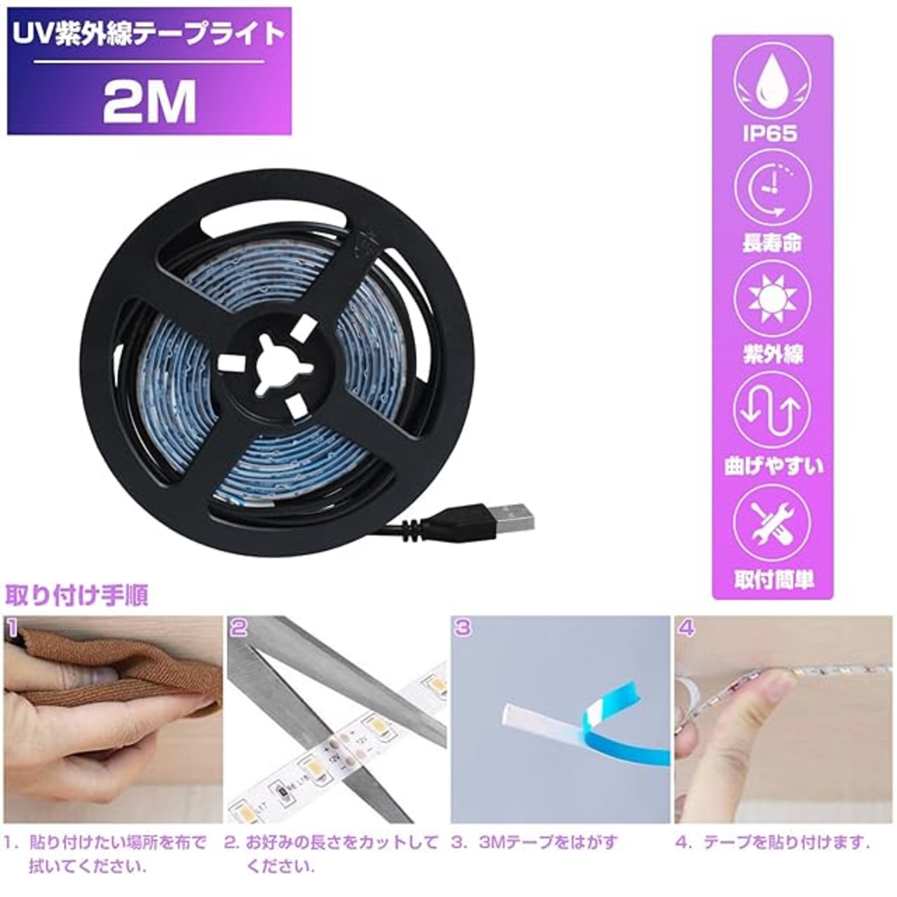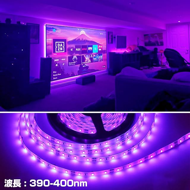 商品名:【グレードアップ版】ブラックライト LEDテープライト USB式 4m 防水 240LED高輝度 5V 390nm~400nm 間接照明 クリスマスライト 雰囲気 室内用 寝室 部屋 店舗 蓄光素材照明