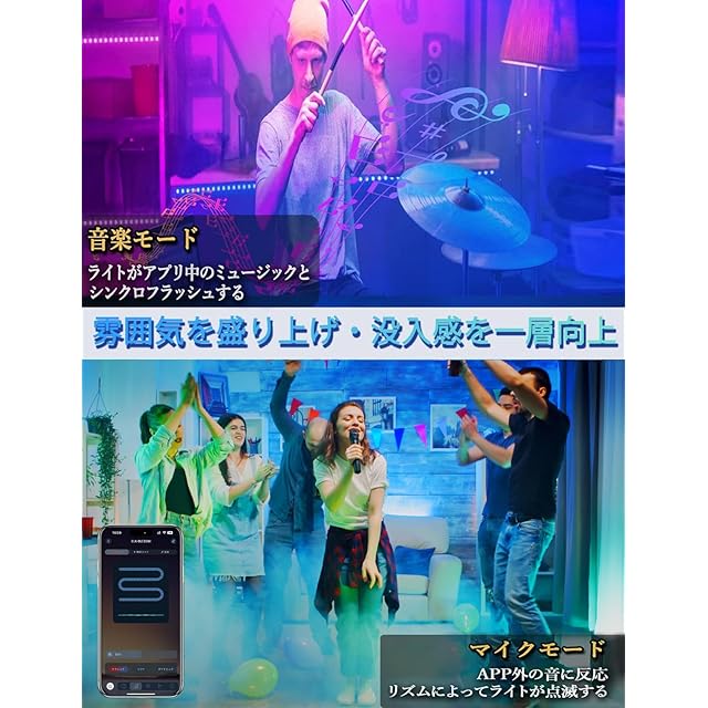 【音楽連動・雰囲気を盛り上げ】コントローラーの内臓マイクが搭載され、スマホなどの音楽や声のリズムに合わせてテープLEDライトの光が変化して、様々な光が演出できます。パーティーの雰囲気を盛り上げ、ゲーム・映画の視聴体験を一層向上させます!