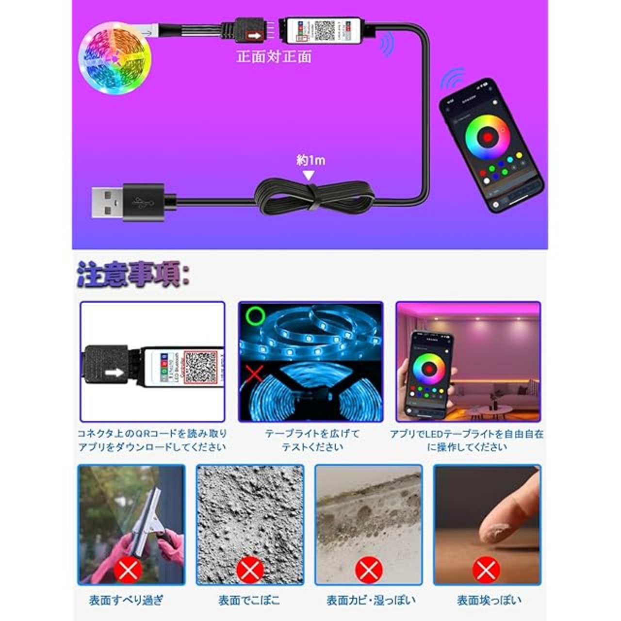 【USB簡単取り付け】両面テープ付、安全電圧5ボルトledテープ、素人でも気楽に取り付けられます。ライトのモードはAPPで制御可、子供でも簡単に操作できます。※ご注意:LEDテープライトの白い部分は若干青みがかっているが、これはRGB LEDの特徴です。
