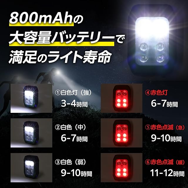 【15パターンの点灯モードで明瞭な被視認性】 白色灯(強・中・弱)3パターン+赤色灯(点灯・急点滅・緩点滅)3パターン+白色/赤色の各組み合わせ9パターン。合計15パターンで暗闇でもはっきりと確認できます。ボタンを押すだけで簡単に切り替えが可能です。