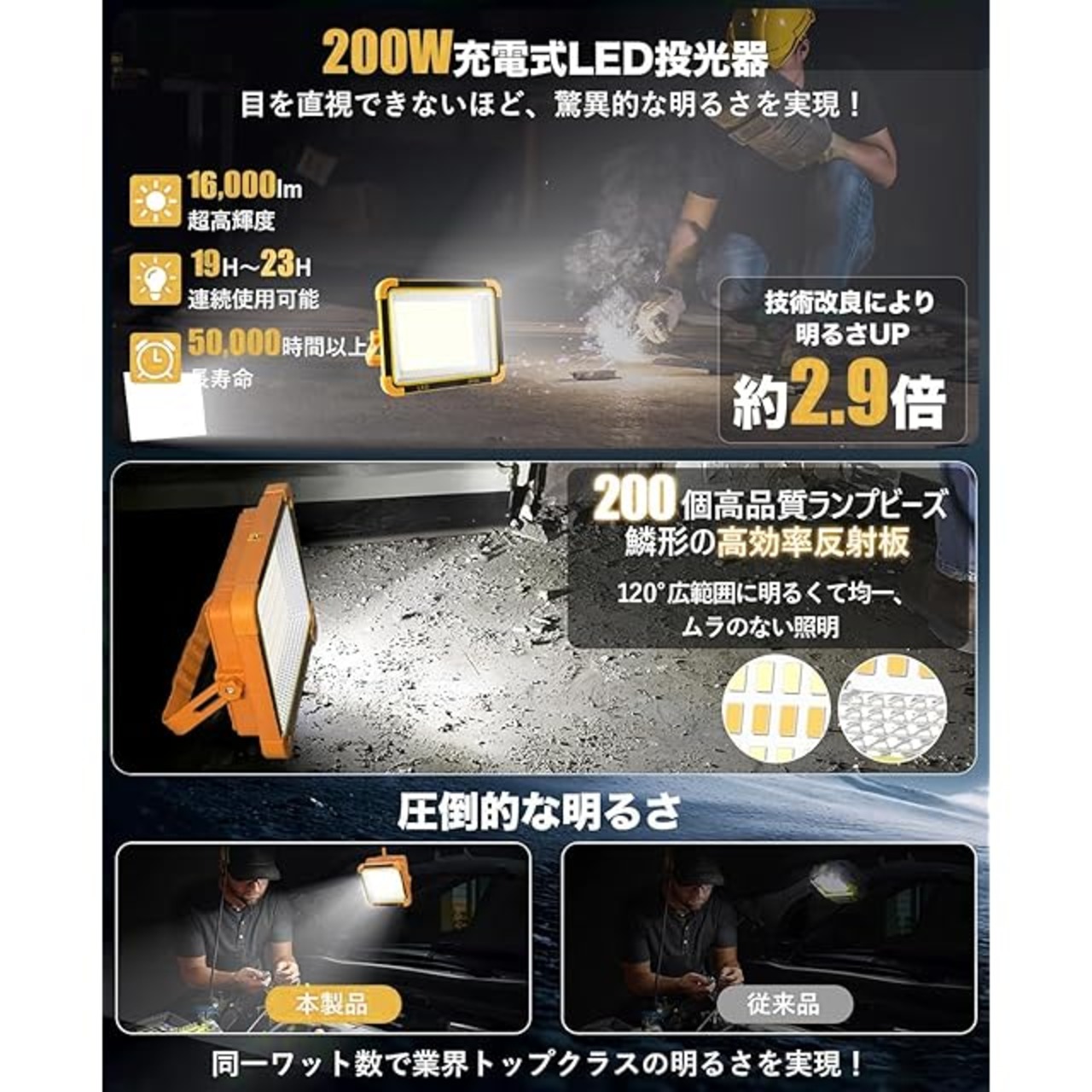 商品名:投光器 作業灯【23時間連続点灯】 200W 16000lm 16000mAH 大容量 led ワークライト IP66防水 超高輝度 USB充電 ソーラ充電 5つ点灯モード 便携式 マグネット フック付き 無段階調光 キャンプ アウトドア 屋外照明 夜間工事 防災 夜釣り 常備灯 停電対策 非常用 ランプ 吊り下げ照明ライト (2025新モデル)