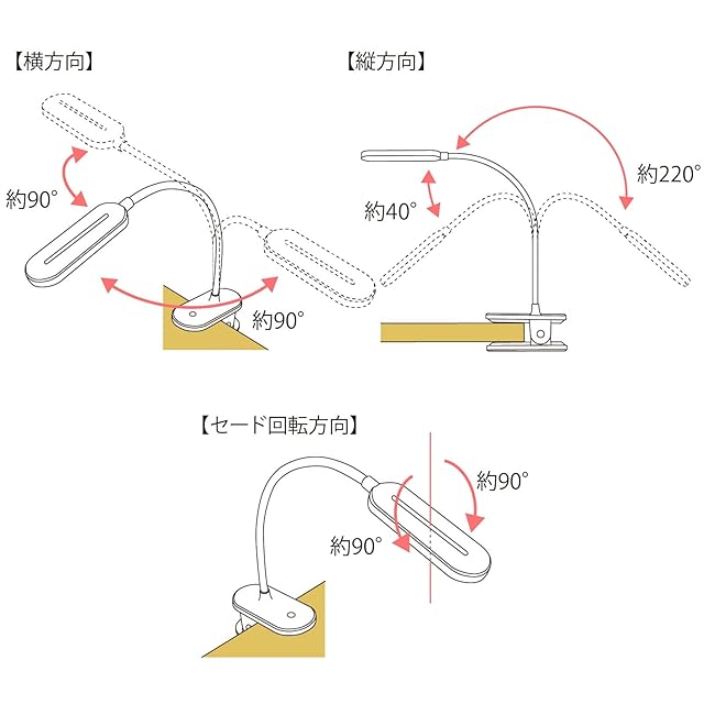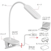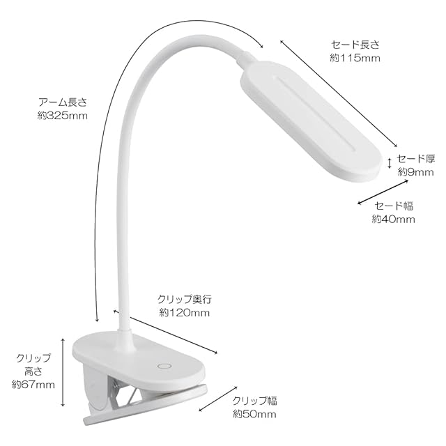 【 仕 様 】■ 消費電力:約2.8W■ 電源:出力5V 1A 以上のUSBポート■ 光源:LED×12灯(交換不可)/昼白色■ 照度:約1000ルクス(直下25cmで点灯時)■ 全光束:約160ルーメン■ クリップ取付可能厚:15mm以上35mm以下■ 本体寸法: セード(約)幅42×高さ10×奥行125mm アーム約300mm クリップ(約)幅58×高さ50×奥行120mm
