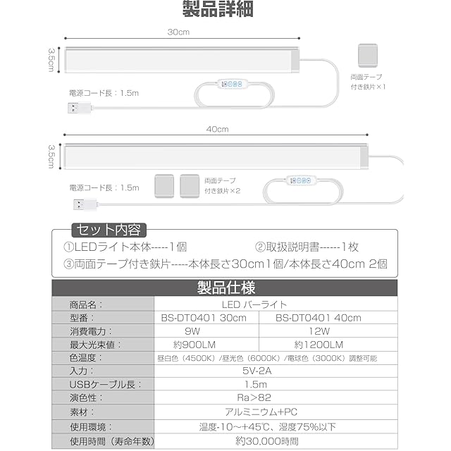 商品名:Baisico LED バーライト キッチンライト 蛍光灯 USB給電 35mmワイド発光面 新型 超高輝度 900LM 9W 消費電力 0.9cm 超薄型 昼光色/昼白色/電球色 3段階色調整、無段階輝度調整可能 側面照射型 側面発光デザイン 均一で柔らかな光 目に優しい マグネット内蔵 強力両面テープ付き鉄パネル内蔵 (30cm)