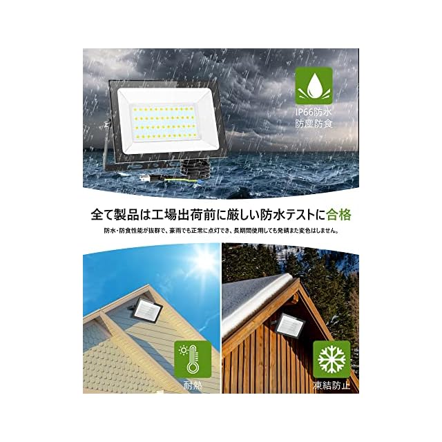 【2023投光器】:「極薄型2.5cm LED投光器」 チップ:SMD チップを採用、広角照射:120°、光束:10000ルーメン(1000w相当) 、色温度6500K(昼光色) 、接続線:1.2メートル°、電圧:100-110V 、重さ:0.5kg 、防塵防水:IP66、 放熱設計:アルミ材質と櫛形ヒートシンク 、定格周波数:50/60Hz、寿命:約6万時間
