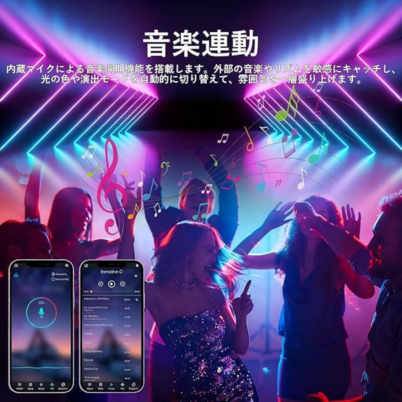 【音楽同期・タイマー機能】このテープライトは音楽連動機能・タイマー機能を備えており、周囲の音楽のリズムに合わせて、光の流れや色が変化できます。また、指定した時間に自動で電源をオン・オフにできます。