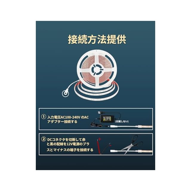 【3つ接続方法提供】①入力電圧AC100-240V のACアダプターを直接に接続してください。②付属品のUSBケーブルを利用して、5V~12Vのスマートフォン用電源アダプター接続してください(アダプタ—は別売り)。③LEDテープライトポートのDCコネクタを切断して赤と黒の配線を露出させ、12V電源のプラスとマイナスの端子を接続します。