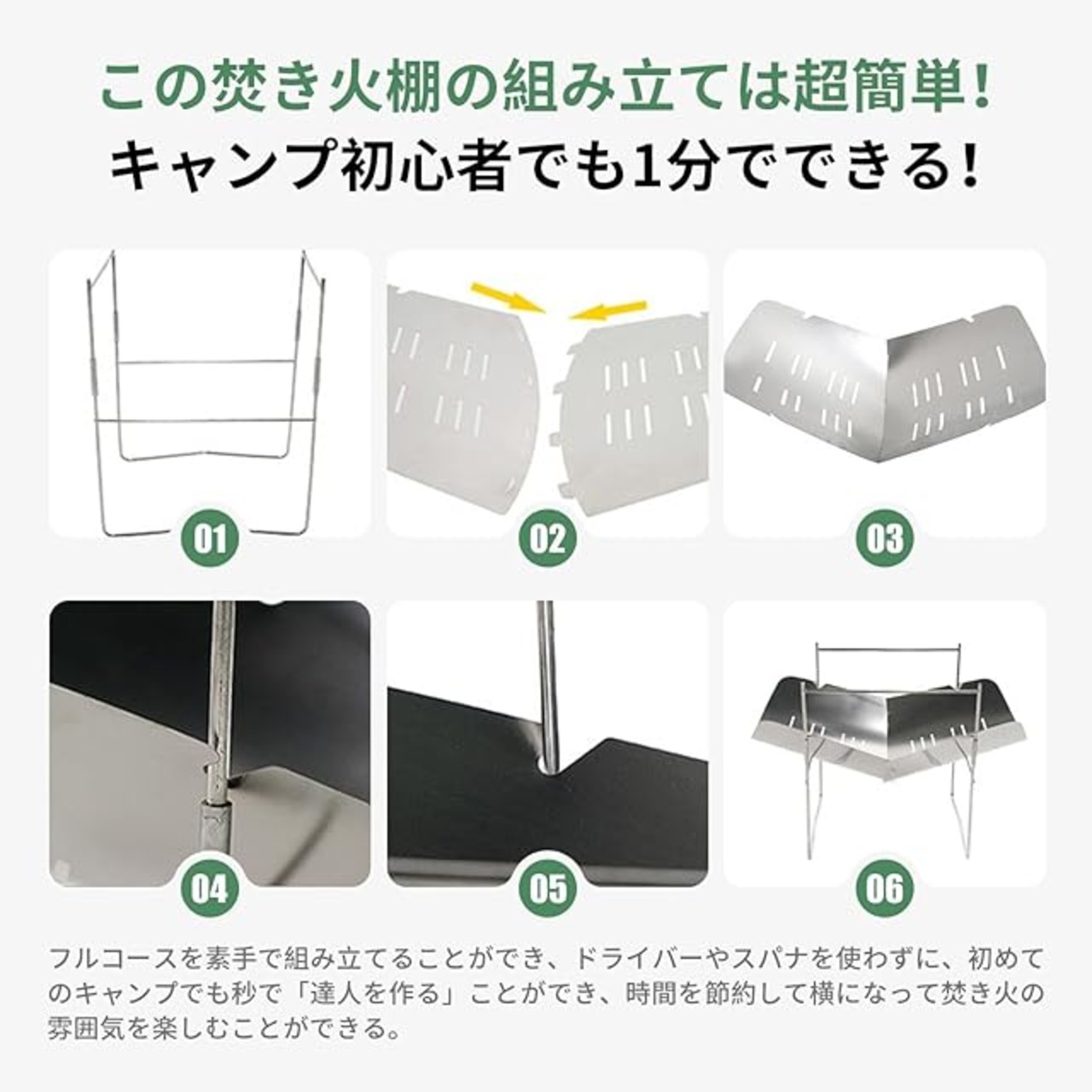 【素材耐久性と構造安定性】キャンプファイヤースタンドは耐熱ステンレス鋼で製造され、防錆・耐高熱性能に優れ、10kg の木材重量に耐えても変形しません。調理スタンドはダブルカードポジション設計で、調理器具を置いても滑落することがなく、専用グリルネットも付属しています。4 つのカードポイント設計により、焼き物を調理する際に食材が滑ることを防ぎます