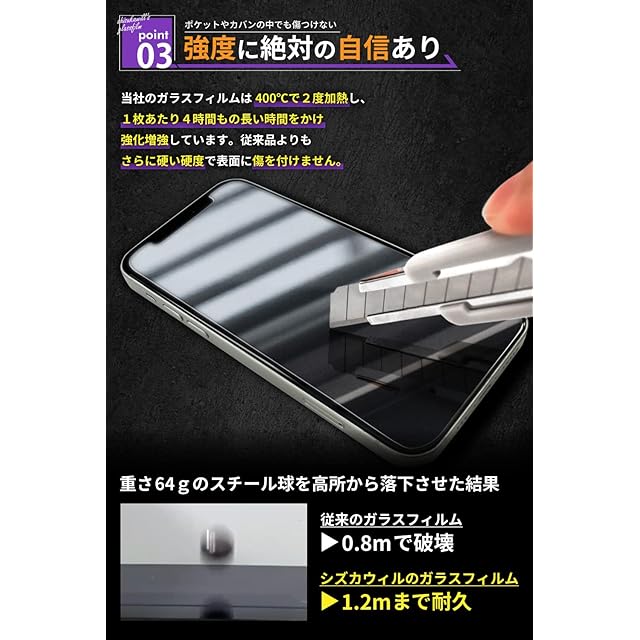 【ナイフでも傷つかない】硬度9H以上でカッターナイフでも傷付かない高強度の強化ガラスフィルム!最先端技術で製造しており、「より割れない」「より浮かない」「角割れしない」ガラスフィルムです