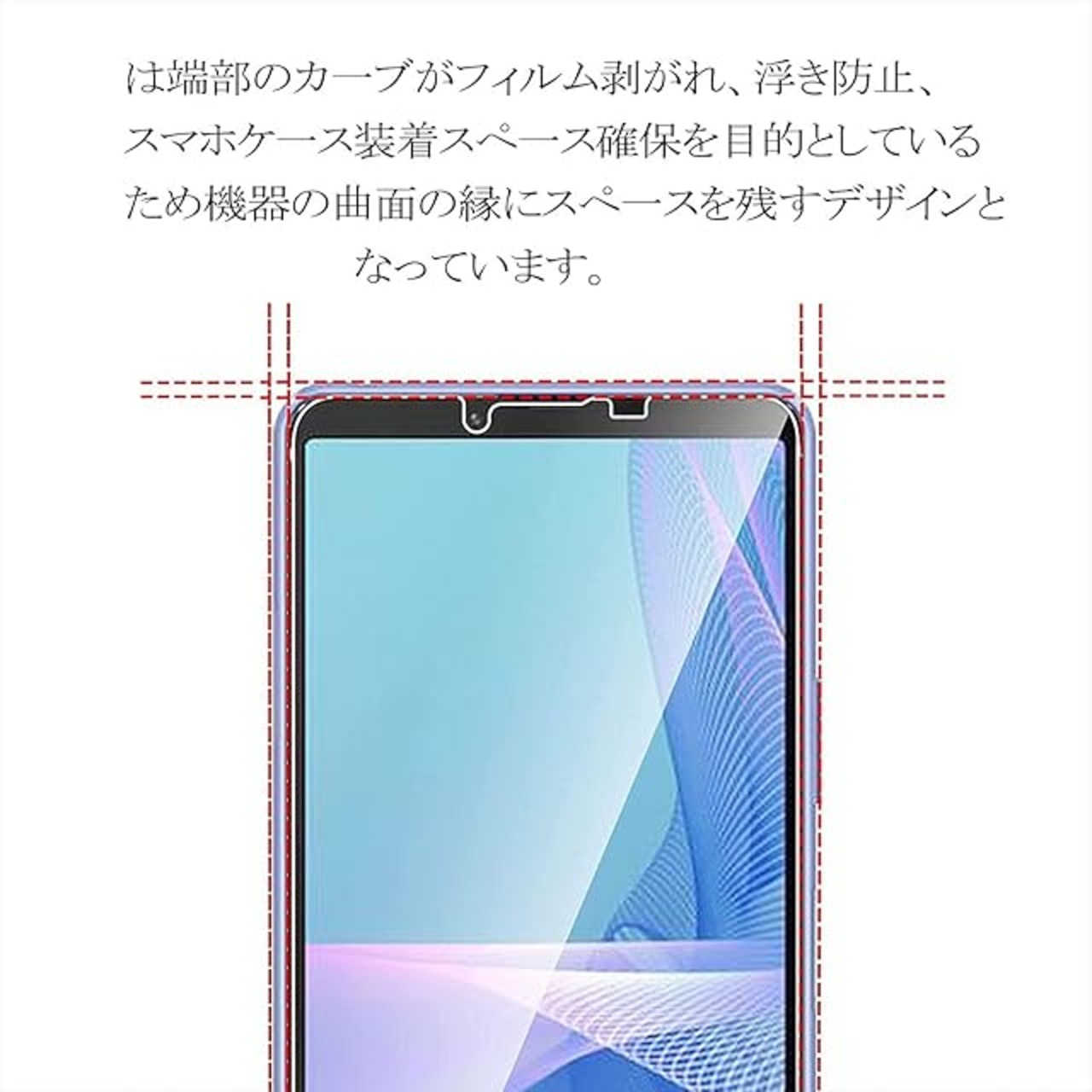 『 対応機種 』Xperia 10 III / Xperia 10III Lite (SO-52B SOG04) に適応しています。携帯は端部のカーブがフィルム剥がれ、浮きの防止、スマホケース装着スペース確保のため、機器の曲面の縁にスペースを残すデザインとなっています。