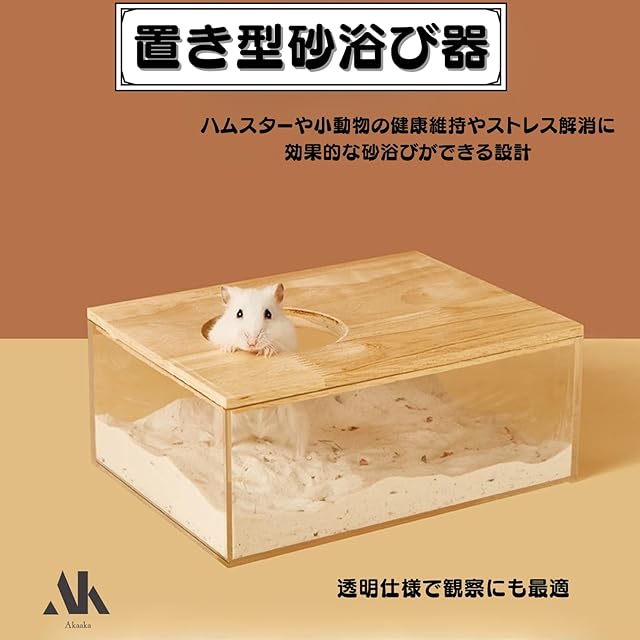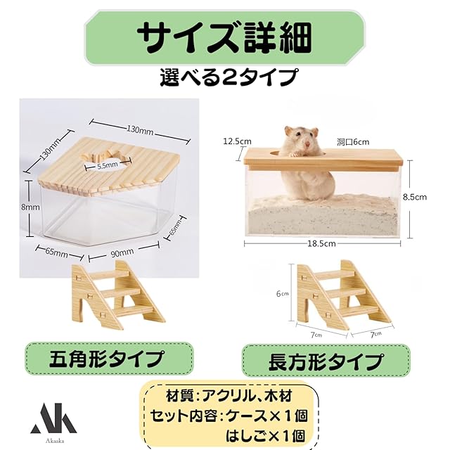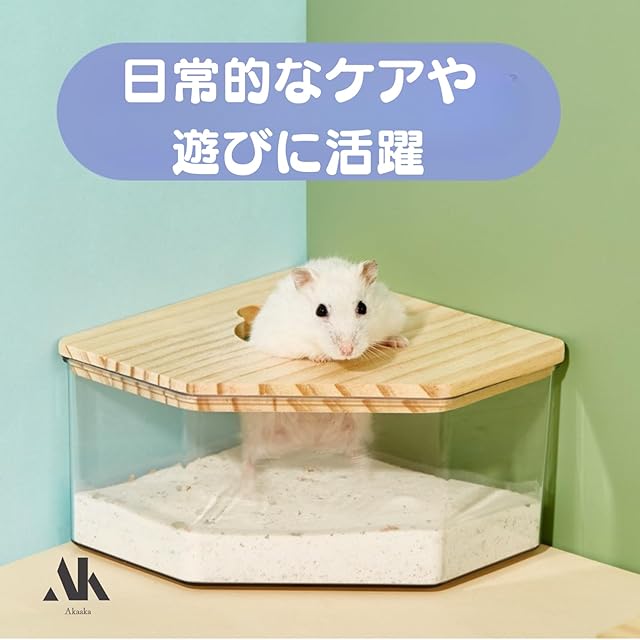 【置き型砂浴び器】ハムスターや小動物の健康維持やストレス解消に効果的な砂浴びができる設計です。透明仕様で観察にも最適です。 【多用途設計】トイレ、砂浴び場、寝床、食料庫など多機能に使える室内空間で、ペットが自由に遊べます 【飛び散り防止構造】砂の飛散を抑えるカバー付きで、激しく砂をかいてもケージ周りを清潔に保ちやすくなっています。 【小動物対応】ハムスター、スナネズミ、リスなど小型ペットに適したサイズと形状で日常的なケアや遊びに活躍するアイテムです。 【商品スペック】サイズ:画像参照、素材:アクリル、木材、セット内容:ケース×1個・はしご×1個、バリエーション:長方形/五角形