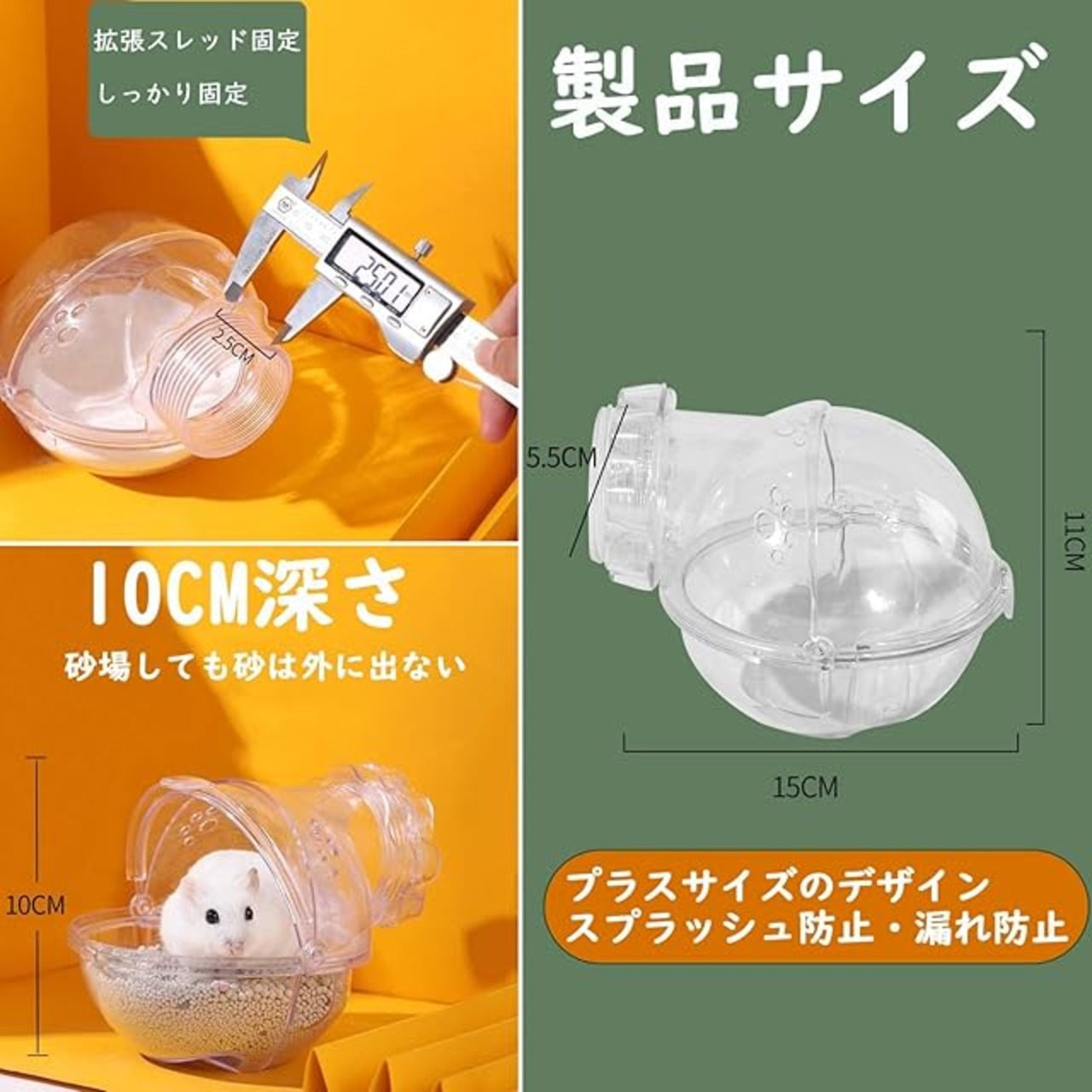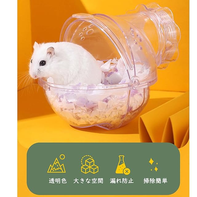 【取り外し可能、掃除簡単】掃除がしやすいし・取り出しも楽良い商品。本体の底の部分は直接簡単に取り外せるので、砂の交換に便利です。掃除したあと簡単に組み立てるます。上下に取り外し可能で延長部が突き出ており、入浴砂の漏れを効果的に防ぎ、掃除簡単で、省スペースです。多機能容器、ハムスターは、お風呂の砂で遊んだり、ハムスター トイレ、ハムスター ハウス、ペットボトル。