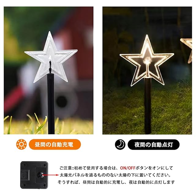 【ソーラー充電】スイッチをオンにして、直射日光の下に置いて、日中は太陽光で自動的に充電し、暗くなると光センサーが感知して、ライトが自動的に点灯します。満充電状態で約8時間点灯できます。