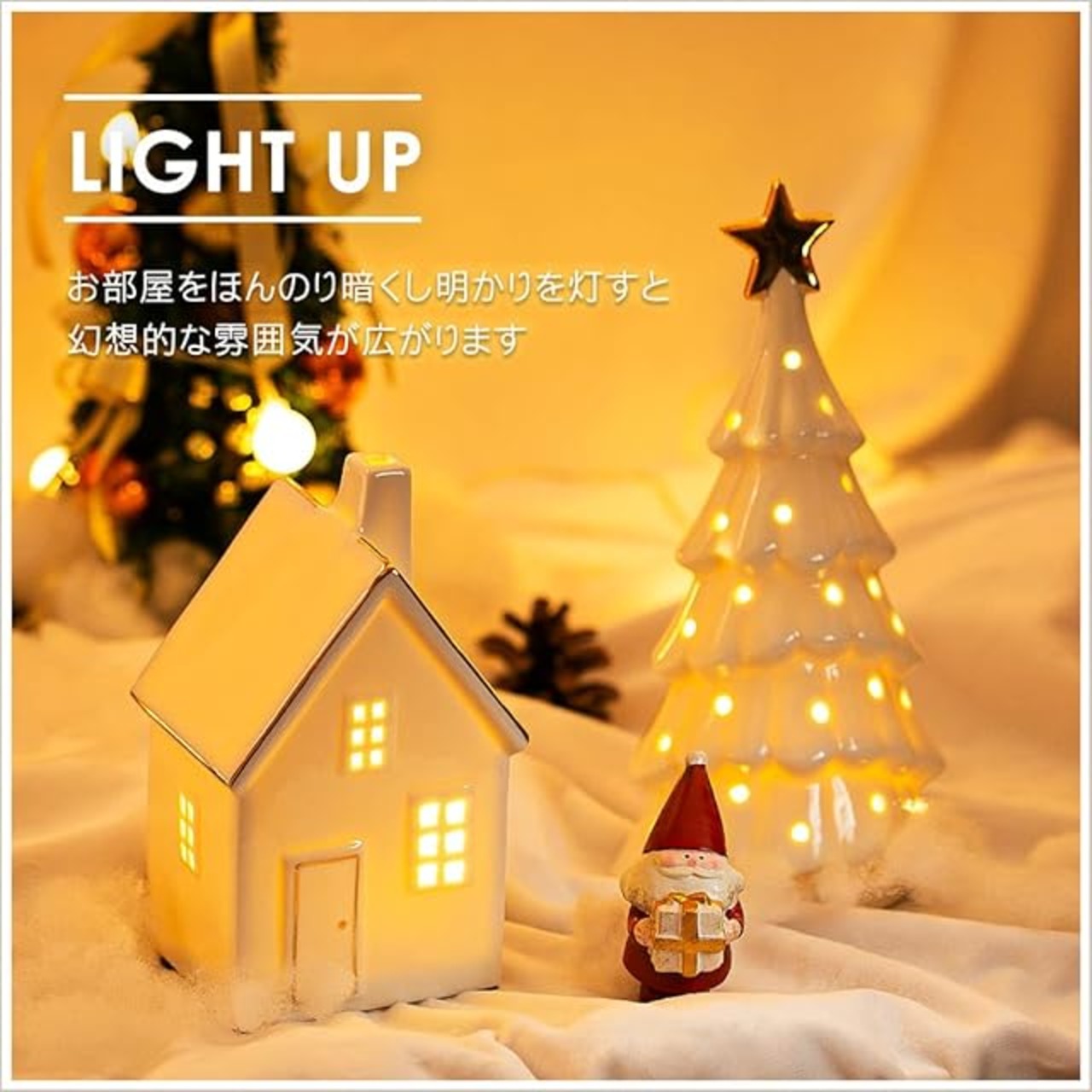隙間から漏れる灯りがきれいなセラミックハウスのセットです。ツリーとハウスとサンタクロースが1セットになっています。 お部屋をほんのり暗くして、優しい灯りで時間を過ごすのも雰囲気があります。お部屋のインテリアにも最適です。 クリスマスの楽しい時間のお友達にして下さい。あなたやあなたの大切な人の癒しになること間違いなしです。
