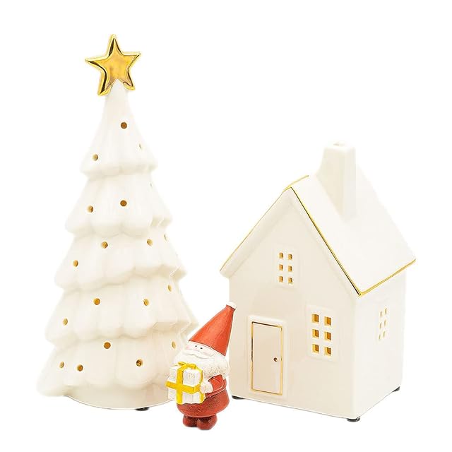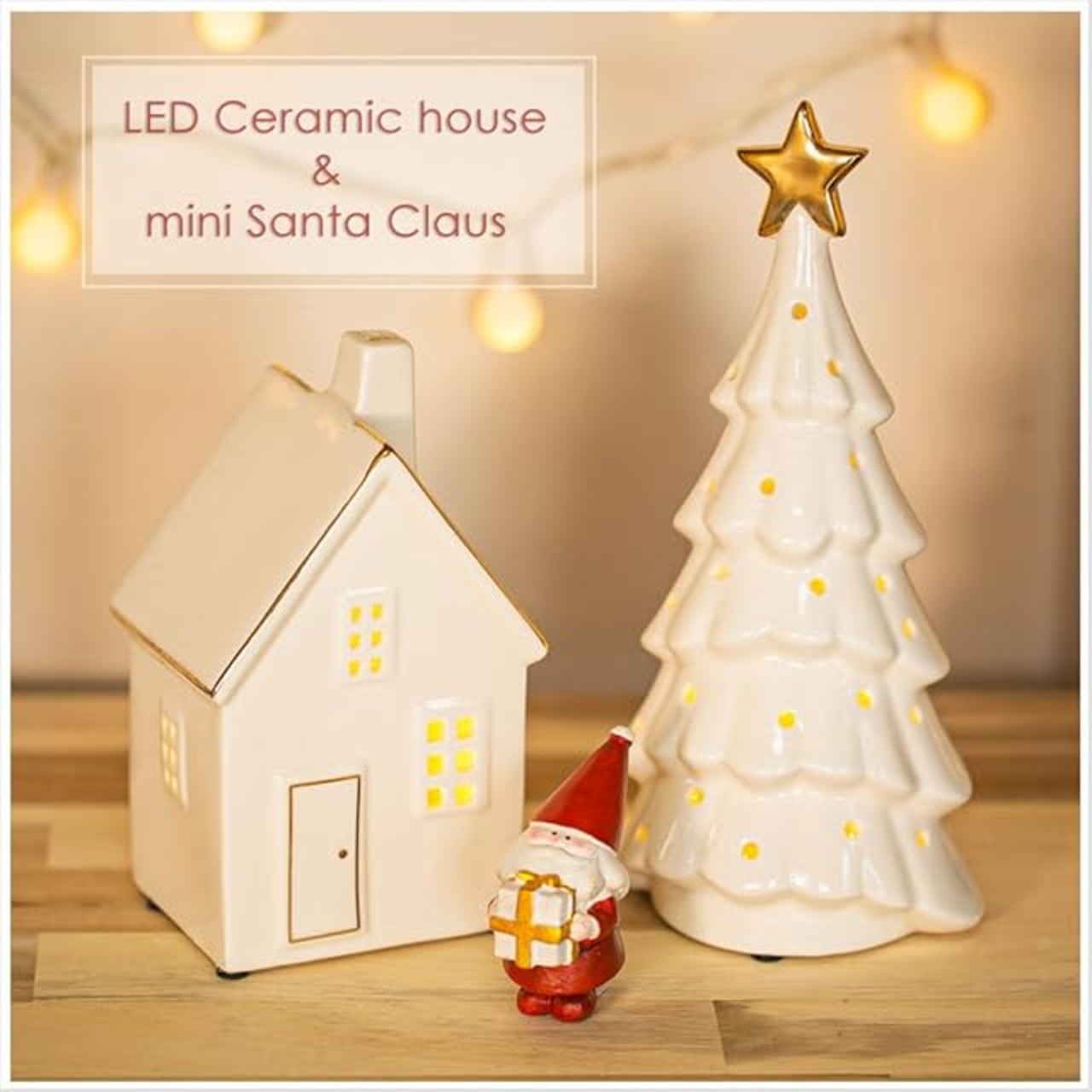 [ギフトショップ ファンシー] 卓上 クリスマス 飾り サンタクロース セラミック 光る クリスマス オーナメント ギフト オブジェ (ツリー1組 ハウス1組 サンタ1組 セット品) (スターツリー&ロッジ) was15