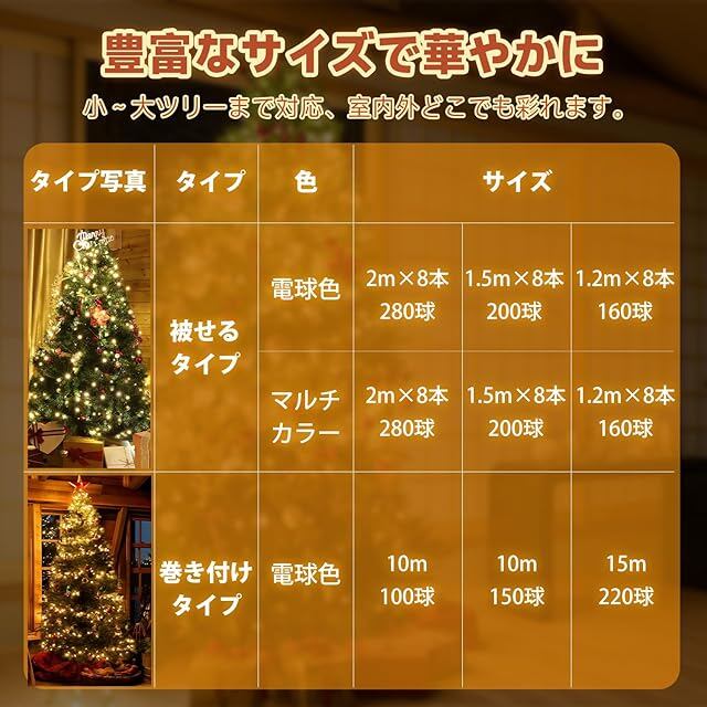 商品名:Salcar 2025新型 LED クリスマスツリー ライト 1.5M×8本 200球 USB式 タイマー付き 被せるタイプ 大型ツリー対応 電球色