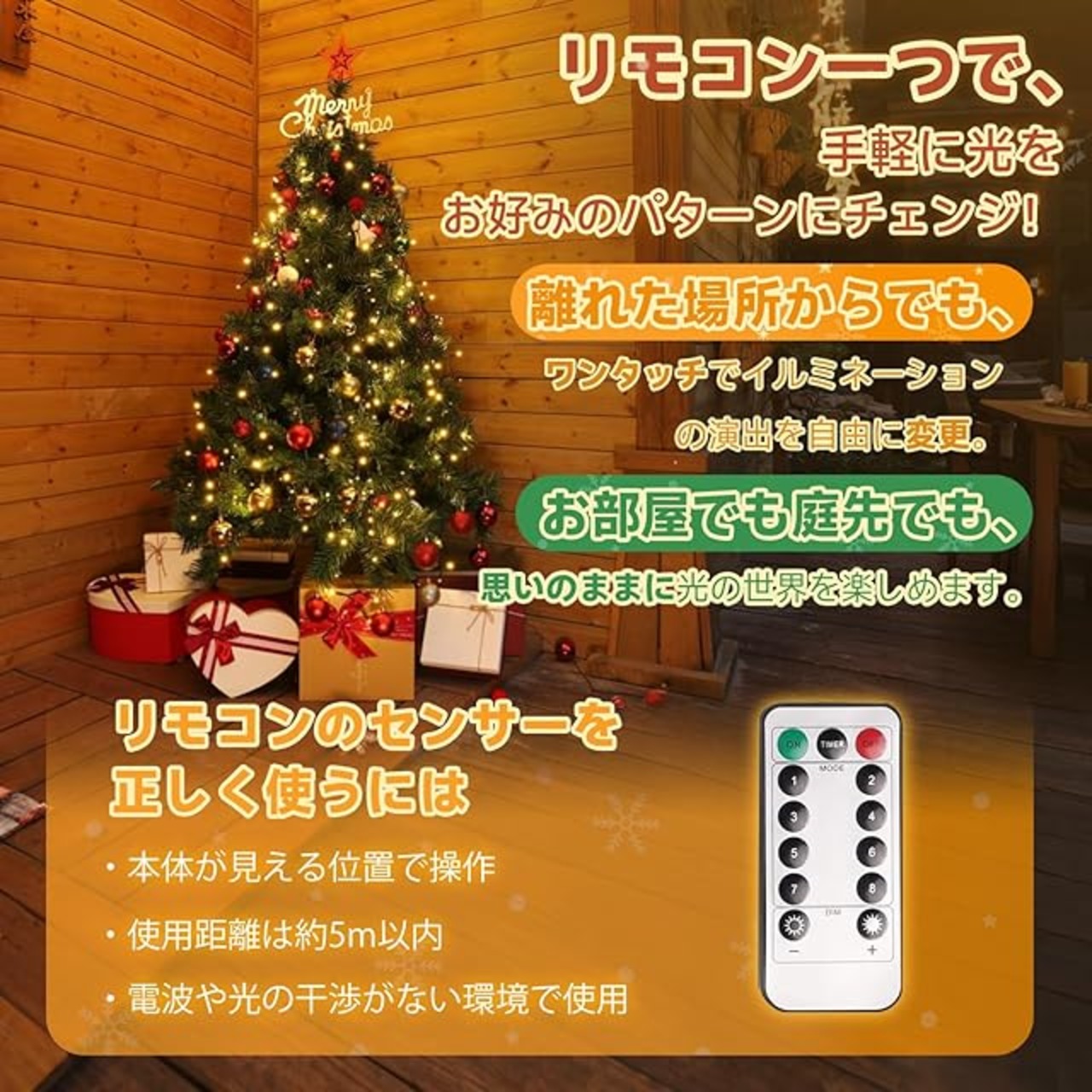 【全8種類の点灯パターン】波のようにゆったりとした点灯から、リズミカルで華やかな点灯まで、8種類の点灯パターンが楽しめるled クリスマス ライトです。USBプラグのボタン操作またはリモコン操作で簡単に切り替え可能です