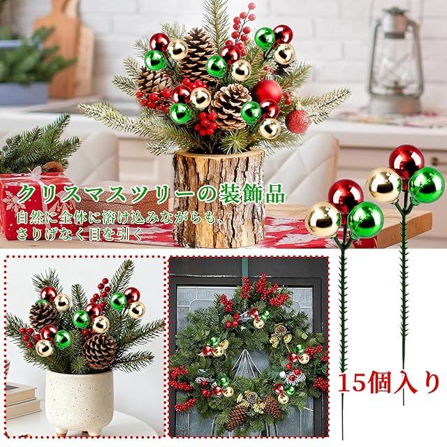 【セット内容】入数:15個入り;カラー:赤、緑、金;サイズ:総長20cm、ボール2.4cm;材質:プラスチックと金属線。十分な量で、家族や友人、クリスマス用品と共有することもできます。