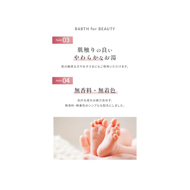 ドイツの希少な泉質「中性重炭酸泉」から着想を得た「薬用BARTH中性重炭酸入浴剤」の独自技術を用いて開発。重炭酸イオン*を長く湯中に溶け込ませる技術はそのままに、美容保湿成分(コラーゲン、ヒアルロン酸)配合の入浴料を実現しました。 * 基剤:炭酸水素Na、炭酸Na
