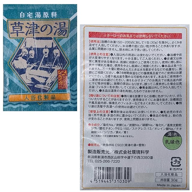 【使用法】浴槽のお湯150~200lに対して1包(30g)を溶かし、 よくかき 混ぜて入浴してください。 ※浴槽の底に白い粒が残ることがありますが、 品質に問題ありません。排水時に水で洗い流してください。ホーローのお風呂では使用しないでください。