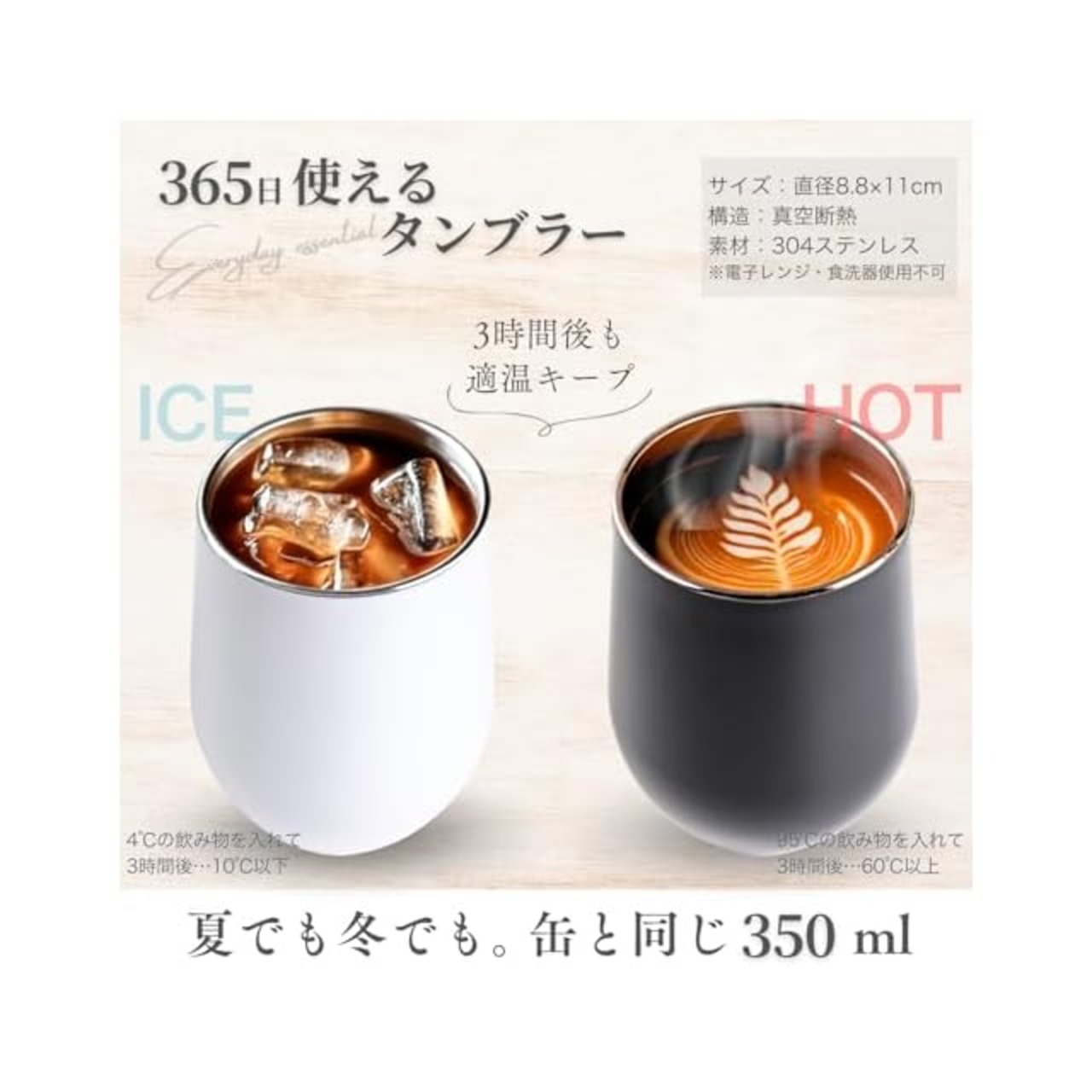 【タンブラーの秘密】 「ゴクゴク飲めて夏でも冬でも快適に」「様々な場所で使いやすい」そんな声をカタチにしました。 真空断熱構造で、ホットもアイスも飲み頃キープ。 350mlのたっぷりサイズだから、コーヒーもお酒も気軽に楽しめます。 フタ付きでホコリが入りにくく、うっかり倒しても安心。見た目はシンプル。でも、毎日のちょうどいいが詰まってます。