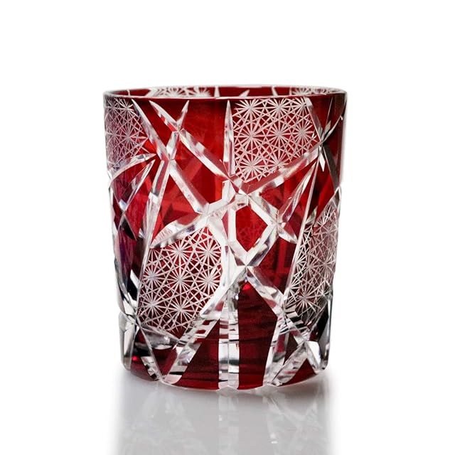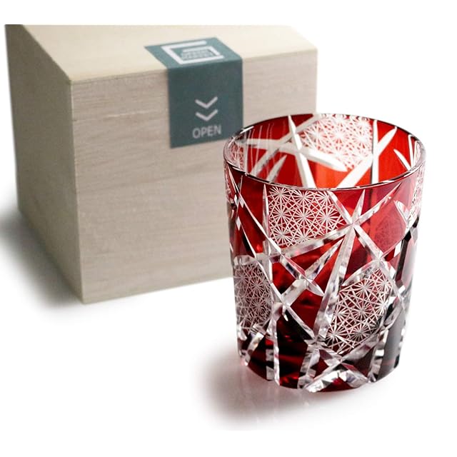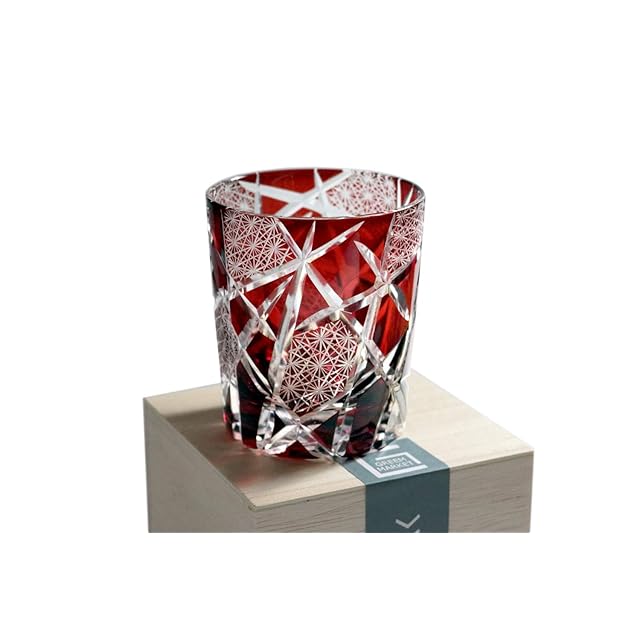 GREEM MARKET(グリームマーケット) 木箱付 工芸品 カットグラス ギフト プレゼント ガラス細工 切子 グラス 菊つなぎ コップ 焼酎グラス ロックグラス レッド 赤 Bタイプ 品番:GMS02510-REDB