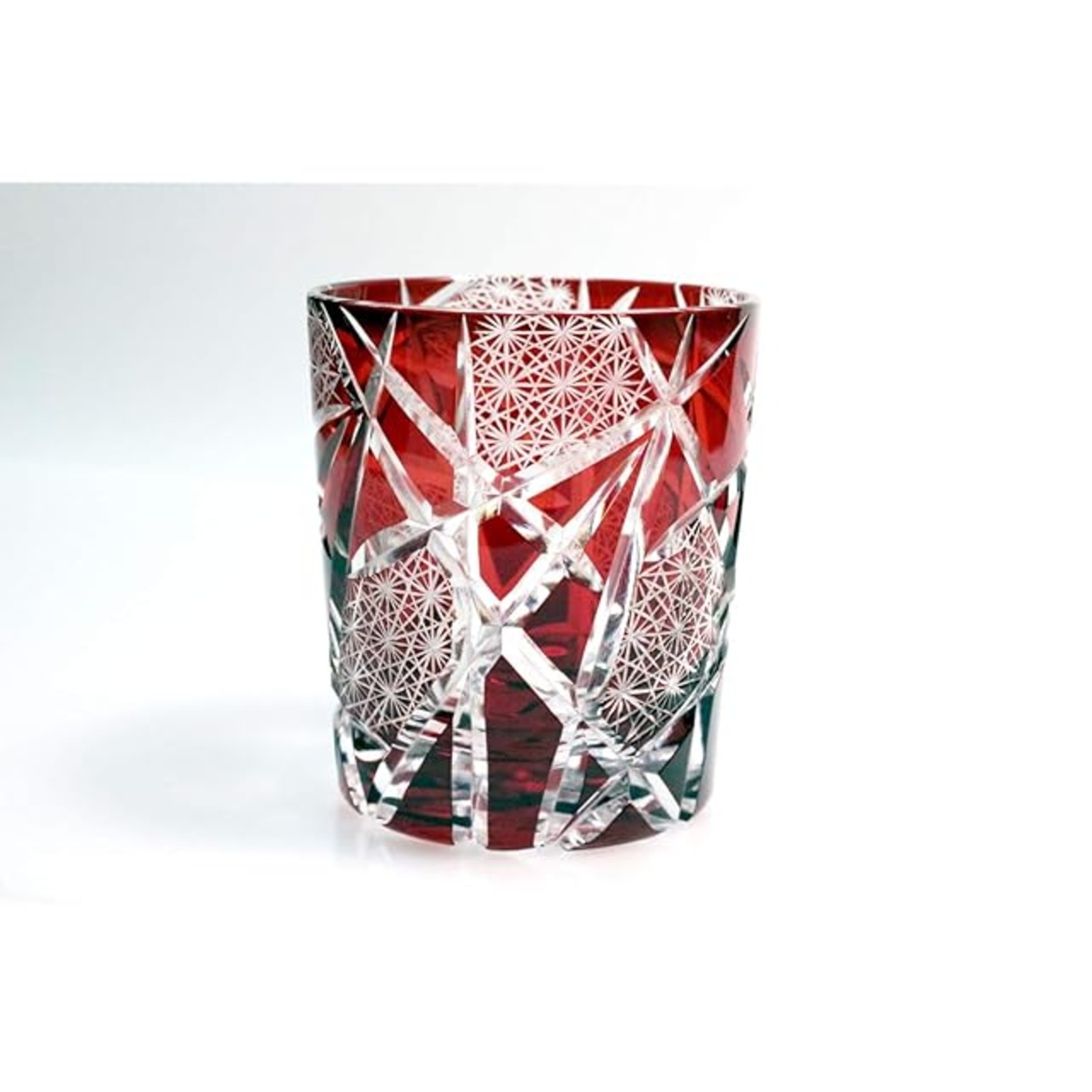 商品名:GREEM MARKET(グリームマーケット) 木箱付 工芸品 カットグラス ギフト プレゼント ガラス細工 切子 グラス 菊つなぎ コップ 焼酎グラス ロックグラス レッド 赤 Bタイプ 品番:GMS02510-REDB