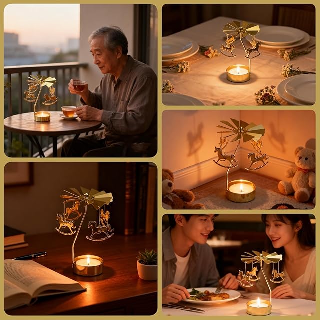 【熱回転ローソク足 - キャンドルに火を灯し】金属製のキャンドルホルダーでロウソクに火をつけると風車が上昇気流でくるくると回ります。キャンドルスティックが光を反射し、近くの壁や天井に広がります。キラキラと輝き、ロマンチックな雰囲気づくりに最適です。