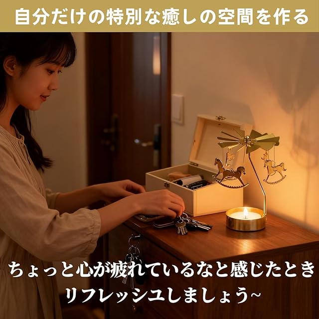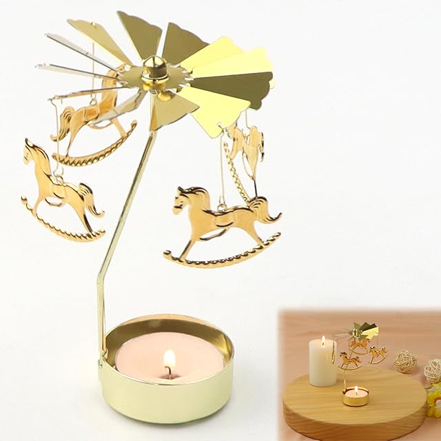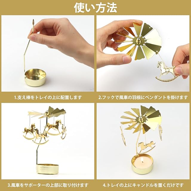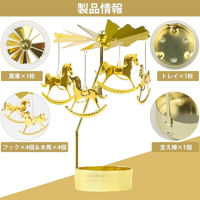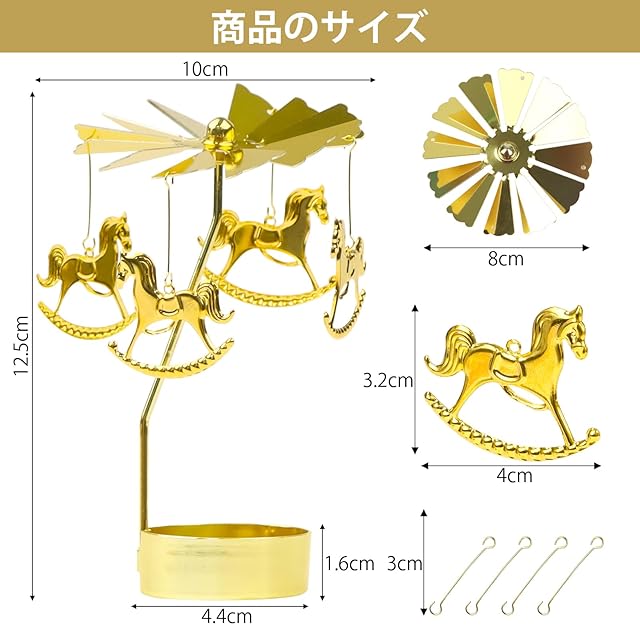 【商品の仕様】色:ゴールド ;素材:アルミニウム合金+銅+鉄;パッケージの内容:風車×1枚 (直径8cm);フック×4個 (長さ3cm);木馬×4個 (長さ4×幅3.2cm);トレイ×1 個(長さ4.4*1.7cm);支え棒×1個(長さ12.3cm)。直径4cm以下、高さ1.6cm以下のキャンドルが、この回転式キャンドルホルダーに適しています。