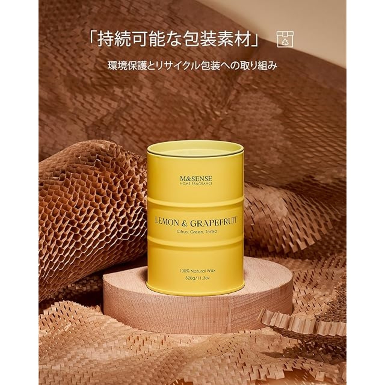 「持続可能なパッケージ」 - M&SENSEキャンドルは最高品質の最も自然な素材で作られています。高級植物性ワックスと無漂白コットンの芯を使用し、再利用可能でリサイクル可能な瓶に入れています。 より持続可能な未来のために、リサイクルされたハニカムペーパーとダンボール箱に梱包されています。