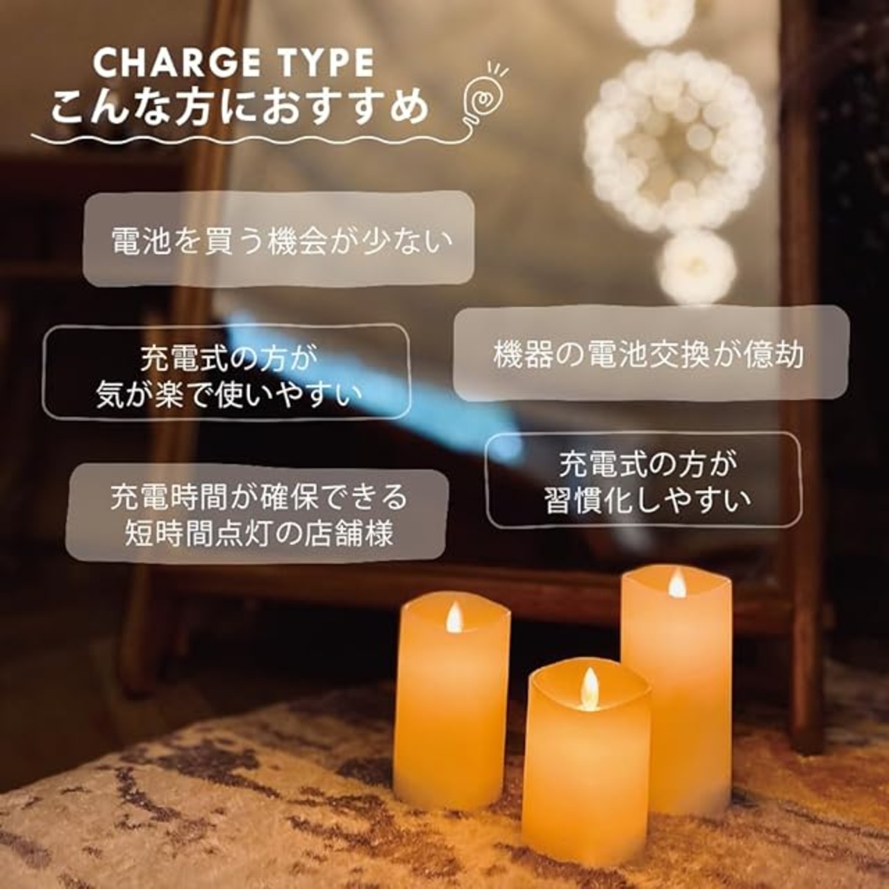 本物のキャンドルのように炎がゆらめくような、優しい色合いのLEDキャンドルライトです。 充電式でコードレスですのでお部屋のどこにでもインテリアとして使用でき、店舗ディスプレイとしても最適。 本製品はLEDでロウソクの炎を再現したキャンドルライトですので、火を使わず熱も持たないので小さいお子さんやペットがいるご家庭でも安心してお使いただけます。