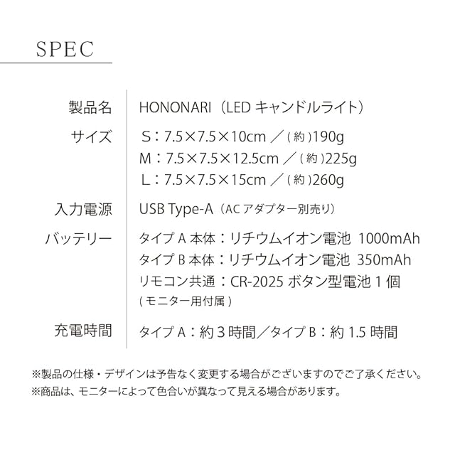 【商品詳細】HONONARI Standard 充電式 (350mAh)【商品仕様】サイズ:L(直径7.5cm×高さ15cm)、M (直径7.5cm×高さ12.5cm)、S(直径7.5cm×高さ10cm) 材質:ワックス(石蝋) / ABS樹脂 ※お届け時はキズ防止の為、LEDキャンドルに透明フィルムを巻いています。 キズや汚れ防止のため、そのままご使用いただいても問題ございませんが、蝋の質感などを感じたい場合は外してご使用ください。【点灯時間】(約)120時間 ※こちらの時間は目安となり、使用状況(タイマーモード使用)等によって異なります。【入力電源】キャンドル本体 : リチウムイオン電池350mAh 専用リモコン : CR-2025ボタン型電池1個(モニター用付属) 【充電時間】(約)1.5時間