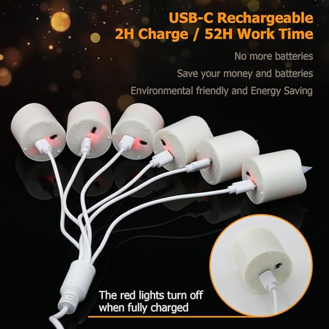 【USB-C 充電式キャンドル】:1 * USB-C充電ケーブル(6ポート)が付属で約2時間で充電完了、50時間くらい連続使用できます。バッテリ使用に必要な費用はかかりません。(作業時間:選択したモード/輝度によって異なります。(例:最も明るい輝度での「明るい」モード:約40時間)