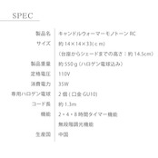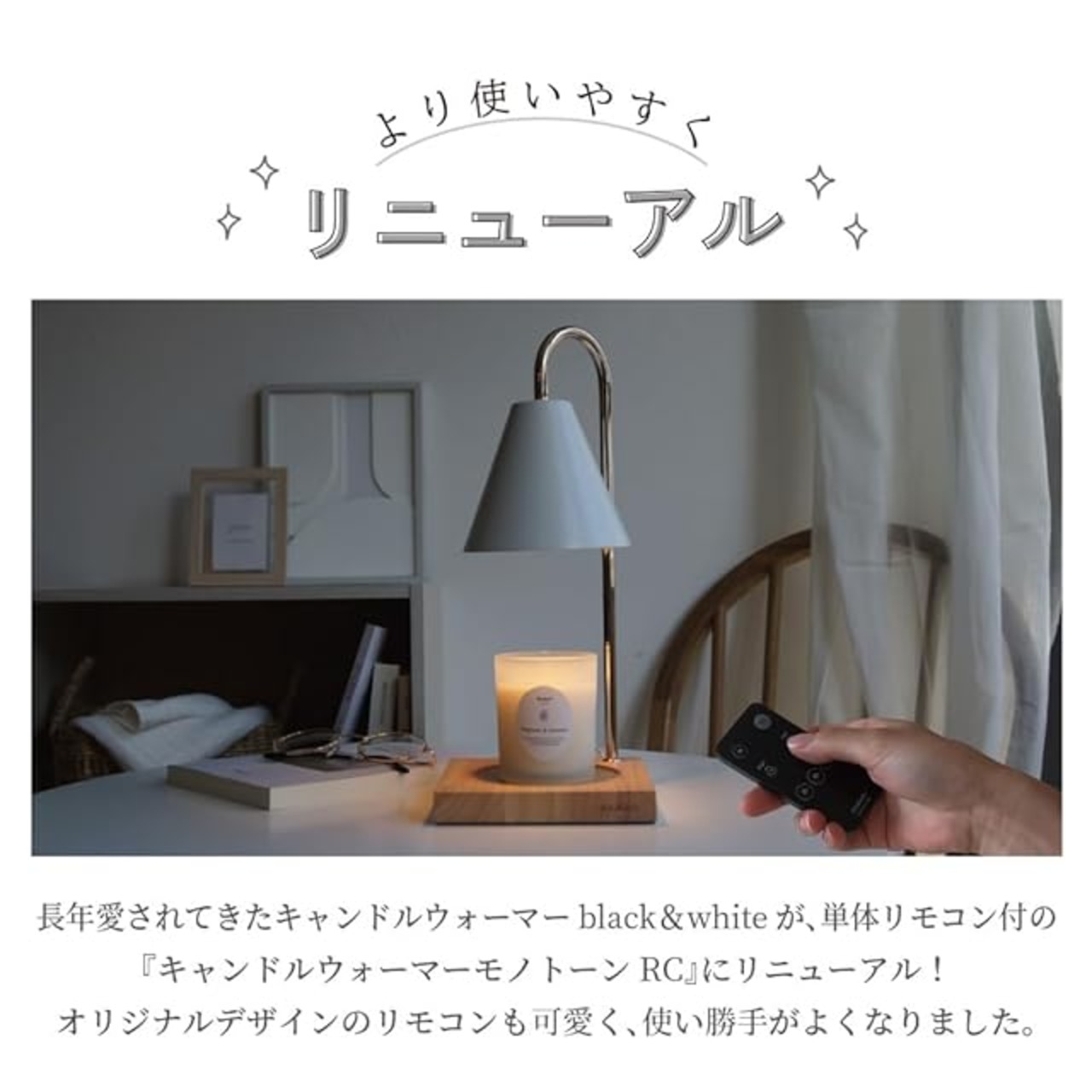 ■遠隔操作リモコン付の『CANDLEWARMER MONOTONE RC』にリニューアル! オリジナルデザインのリモコンも可愛く、使い勝手がよくなりました。 約10mまでの範囲ならリモコンで操作が可能です。 ■火を使わずにキャンドルの香りを楽しめる便利アイテム ここ数年で耳にすることが増えた「キャンドルウォーマー」。 ハロゲン電球の熱を使用するため、空調や風の影響を受けず、火が苦手な方もお手軽に安心してキャンドルが楽しめます。 さらに、火を消した時の芯の焦げや匂い、焦げ跡もないので、キャンドルの外観がきれいなままアロマの香りだけが空間に広がります。