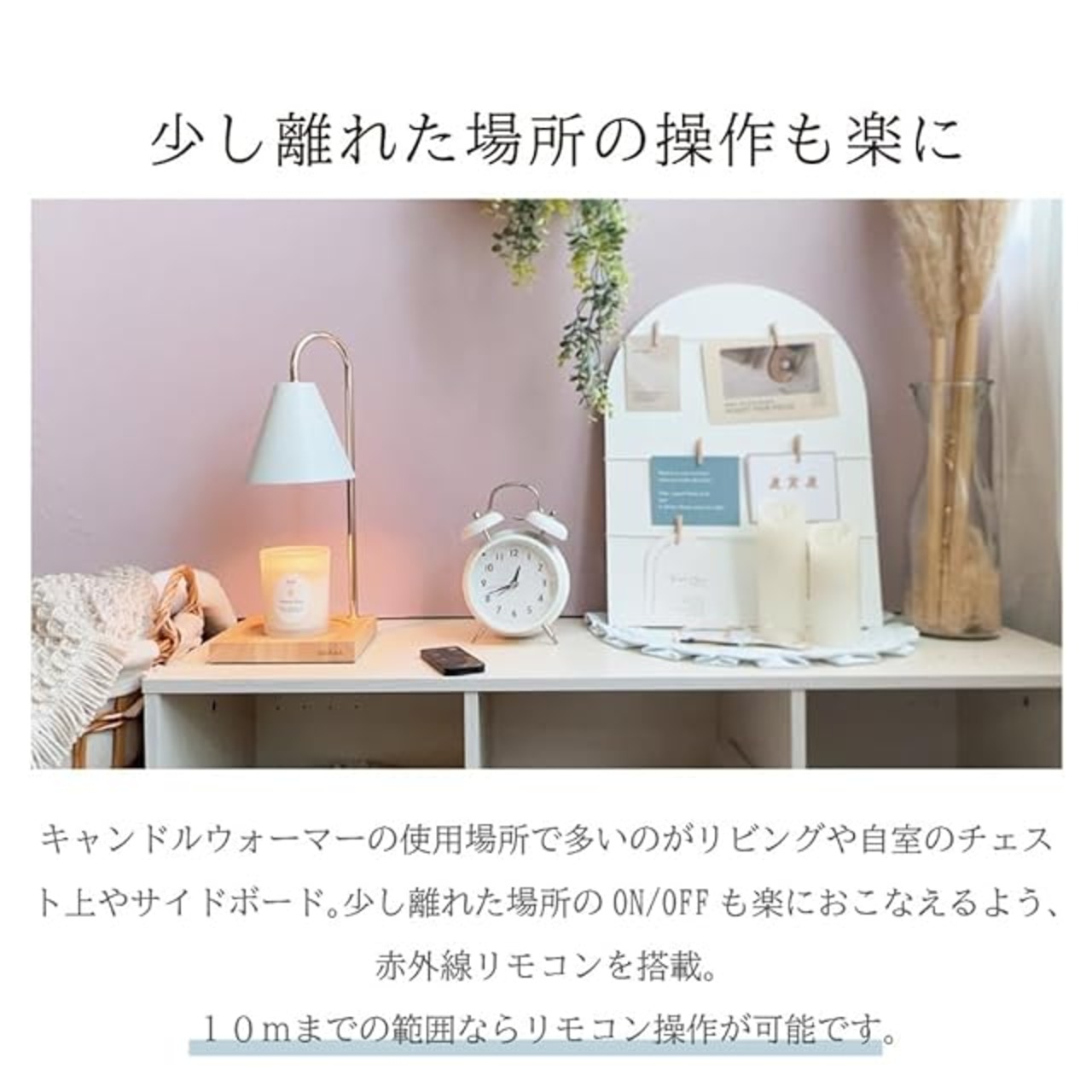 ✅【特徴】■遠隔操作リモコン付の『CANDLEWARMER MONOTONE RC』にリニューアル!オリジナルデザインのリモコンも可愛く、使い勝手がよくなりました。約10mまでの範囲ならリモコンで操作が可能です。■火を使わずにキャンドルの香りを楽しめる便利アイテム。ここ数年で耳にすることが増えた「キャンドルウォーマー」。 ハロゲン電球の熱を使用するため、空調や風の影響を受けず、火が苦手な方もお手軽に安心してキャンドルが楽しめます。さらに、火を消した時の芯の焦げや匂い、焦げ跡もないので、キャンドルの外観がきれいなままアロマの香りだけが空間に広がります。■2・4・8時間タイマー機能と無段階調光:タイマーをセットすれば、自動消灯が可能。合わせて明るさの調節が可能なので、好きな香りと心地よい明るさのまま就寝も。■ギフトにもおすすめ:インテリア性が高いキャンドルウォーマーはギフトにもぴったり。 誕生日やクリスマス、母の日やホワイトデー、記念日など、女性がもらって嬉しいギフト商品です。