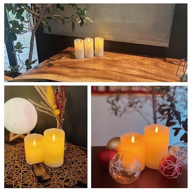 【商品仕様】サイズ:L(直径7.5cm×高さ15cm)、M (直径7.5cm×高さ12.5cm)、S(直径7.5cm×高さ10cm)、個数:3個/点灯モード:揺らぎ・一定 キャンドル本体の電池:単3電池(各2本・別売り) リモコン用電池:ボタン電池1個(付属)