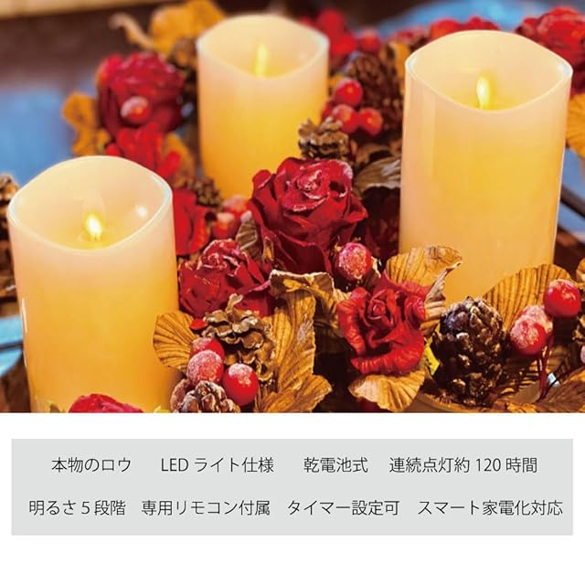 【注意事項】・本製品は本物の蝋を使用しております。 ・本体を火気に近づけたり、火を点けたりあぶったりしないでください。 ・紫外線による退色・変色を避けるため、直射日光のあたる場所を避け、涼しいところで保管してください。 ・キャンドル本体用の電池は付属しておりませんので別途ご購入下さい。※専用リモコン用の電池はモニター用として付属しております。 ・本製品の色合い、形など、キャンドルごとに個体差があります。 ・性質上、本体に衝撃を与えると破損するおそれがありますのでご注意ください。 ※商品は、モニターによって色合いが異なって見える場合があります。 ※仕様・デザインは改良のため予告なく変更することがあります。